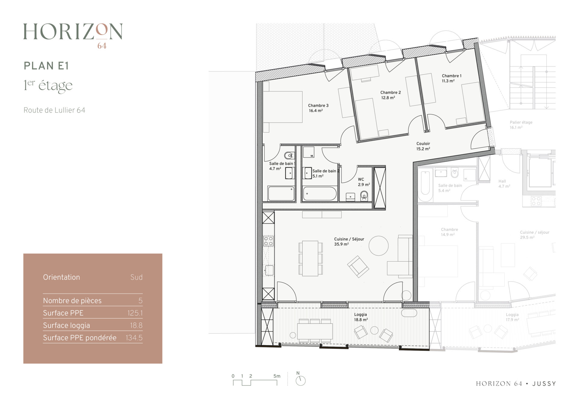 | E1 | 1er étage | 5 | 125 m2 | ||||||