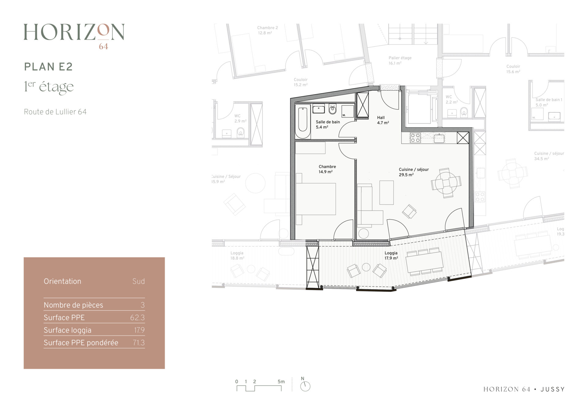 | E2 | 1er étage | 3 | 62 m2 | ||||||