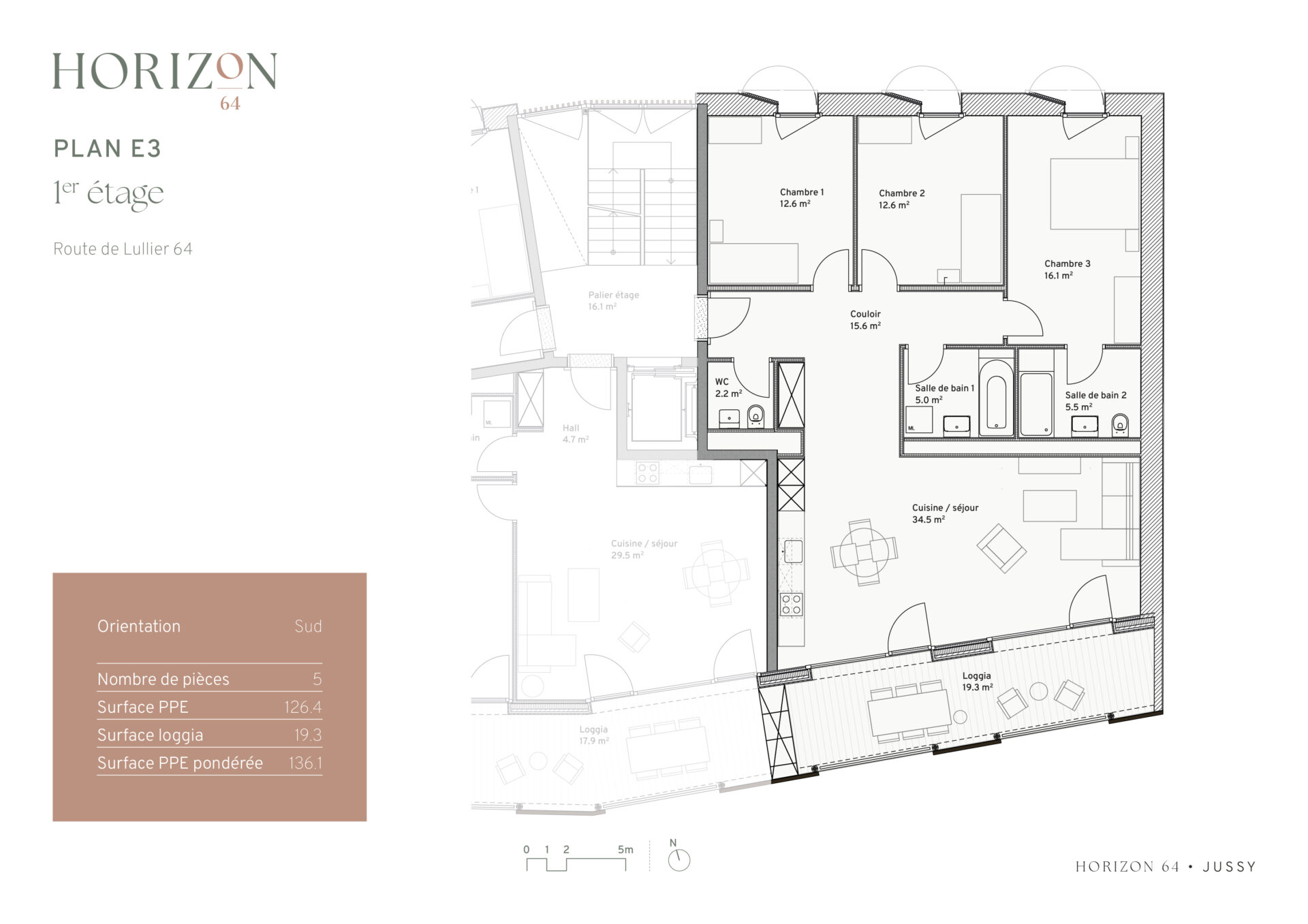| E3 | 1er étage | 5 | 126 m2 | ||||||
